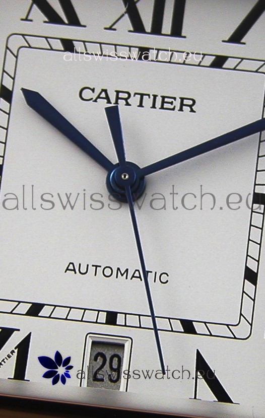 White Dial with Roman Hour Numerals, Date Window at 6 O'Clock and Signature Cartier Markings at the 7 O'Clock Counter. Blue Sapphires on Stem Tip