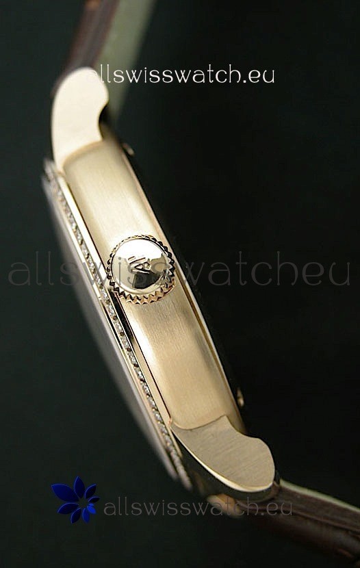 Case: 18K Gold Plated on 440 Solid Stainless Steel Case with Swiss Cut Diamonds Bezel
