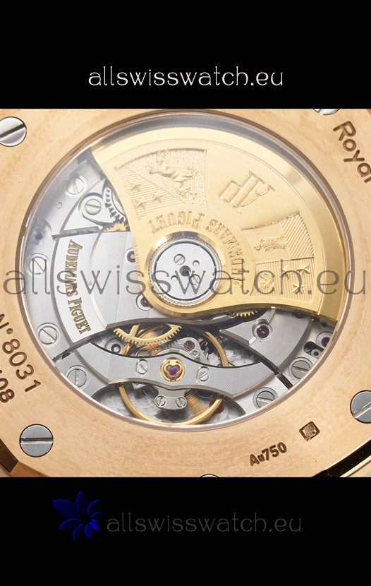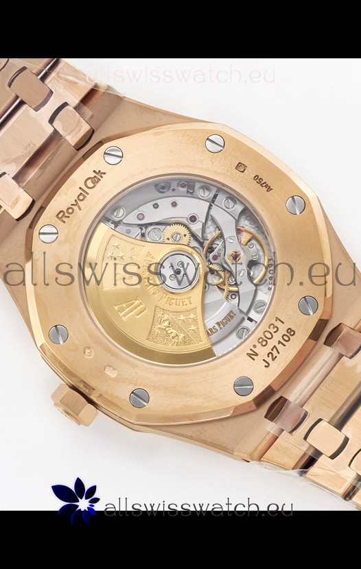 18K Rose Gold Plating on 904L Solid Stainless Steel Case and Bezel. Open Case Back with Stainless Steel Cover