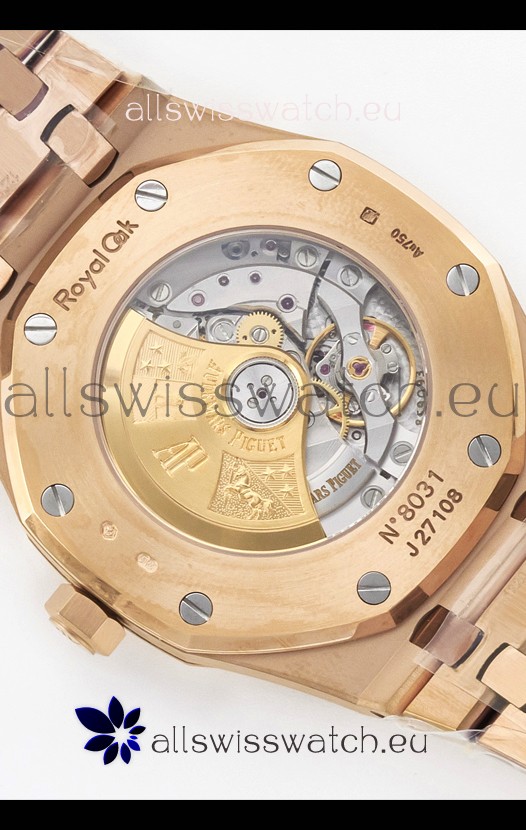 18K Rose Gold Plating on 904L Solid Stainless Steel Case and Bezel. Open Case Back with Stainless Steel Cover