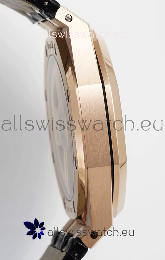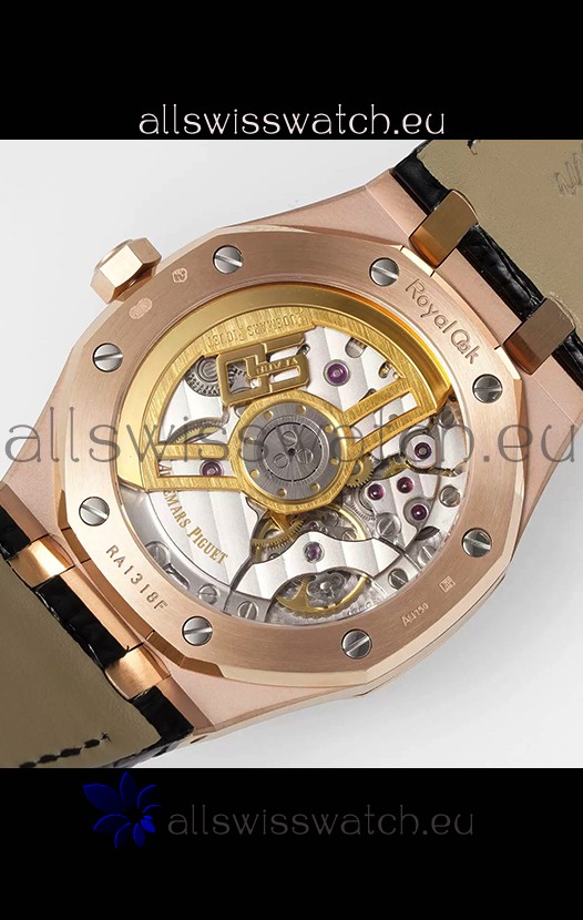 Rose Gold Plating on 904L Solid Stainless Steel Case and Bezel. Open Case Back with Stainless Steel Cover