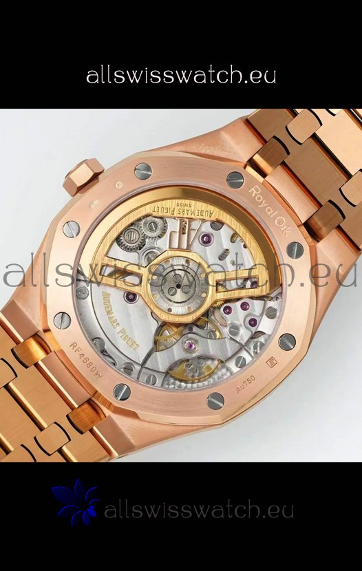 18K Rose Gold Plating on 904L Solid Stainless Steel Case and Bezel. Open Case Back with Stainless Steel Cover