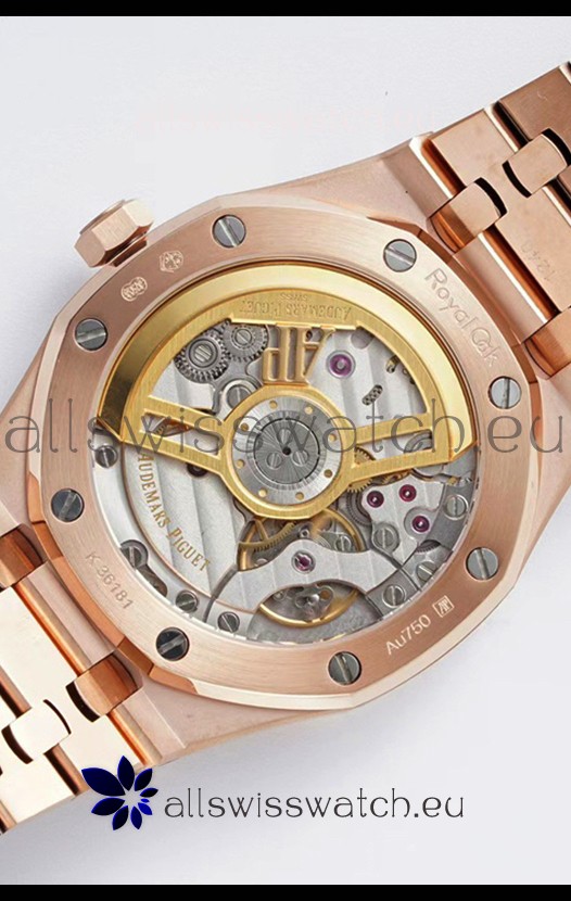 18K Rose Gold Plating on 904L Solid Stainless Steel Case and Bezel. Open Case Back with Stainless Steel Cover