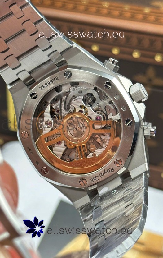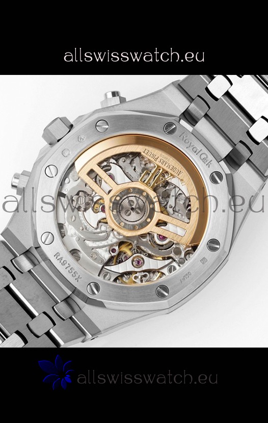Machinery Layout exactly like Audemars Piguet 4401 Calibre Movement used in Authentic Audemars Piguet Offshore Watches. Built on Genuine Swiss 7753 Movement architecture with Functional stopwatch feature like the authentic with Seconds hand running at the 12 o clock Sub Dial