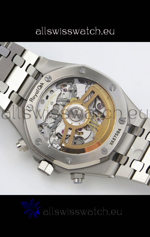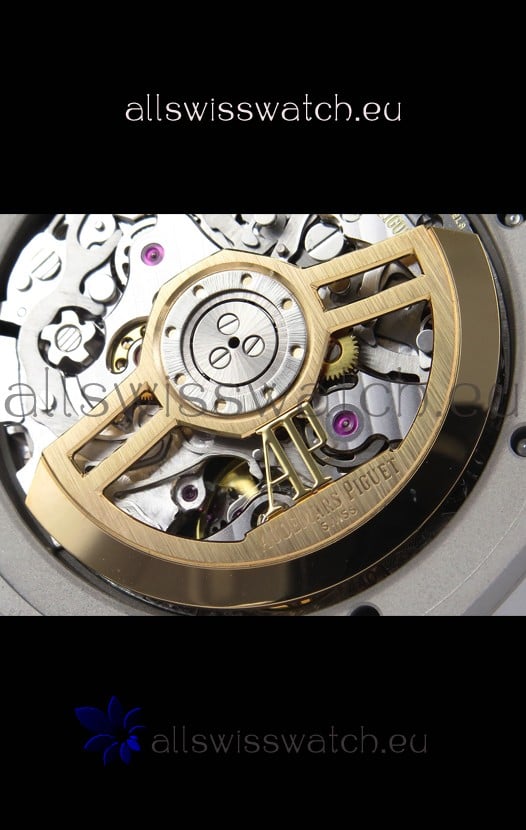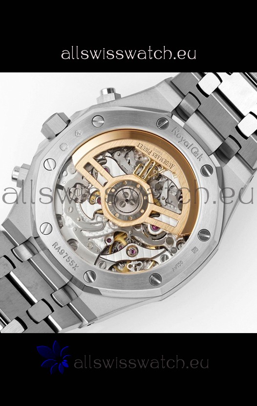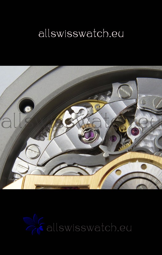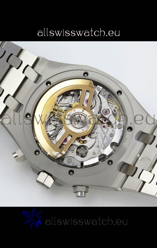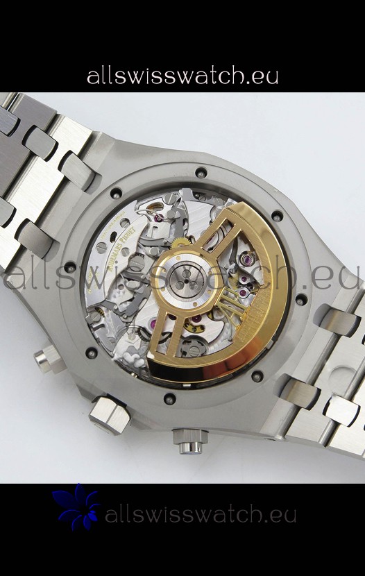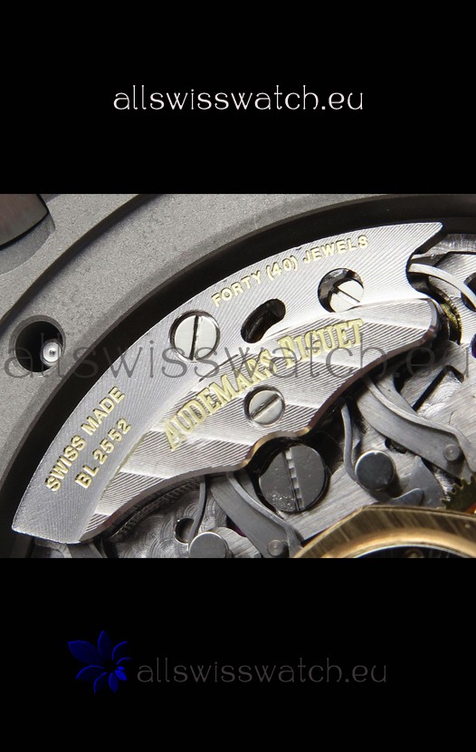 Machinery Layout exactly like Audemars Piguet 4401 Calibre Movement used in Authentic Audemars Piguet Offshore Watches. Built on Genuine Swiss 7753 Movement architecture with Functional stopwatch feature like the authentic with Seconds hand running at the 12 o clock Sub Dial