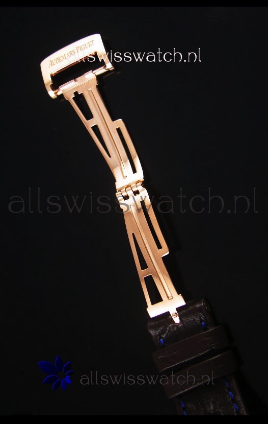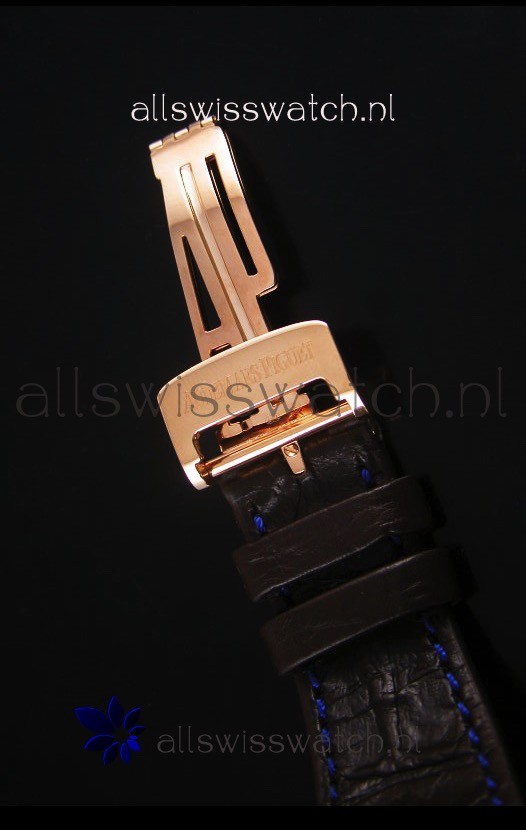 Brown Hornback Leather Strap with Blue Stitching and Yellow Gold Polished Deployment Clasp.