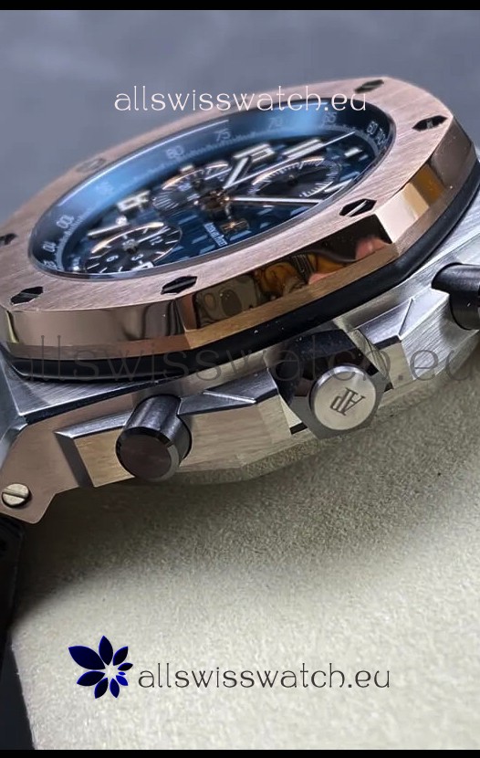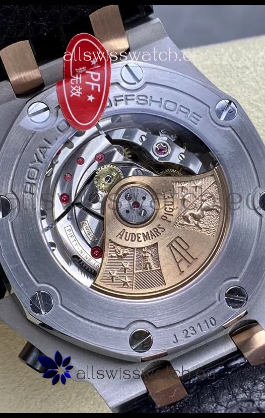 Machinery Layout exactly like Audemars Piguet 3126 Calibre Movement used in Authentic Audemars Piguet Offshore Watches built on Genuine Swiss 7753 Movement architecture with Functional stopwatch feature like the authentic with Seconds hand running at the 12 o clock Sub Dial