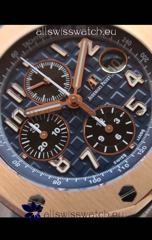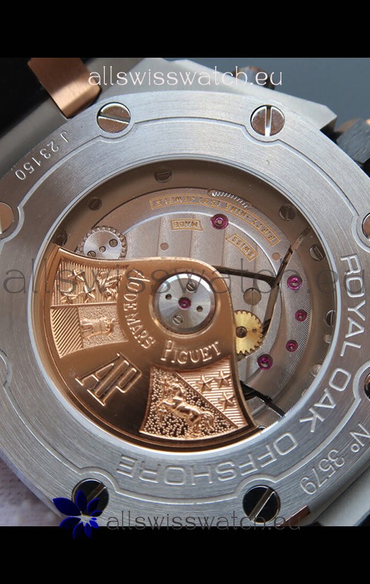 Machinery Layout exactly like Audemars Piguet 3126 Calibre Movement used in Authentic Audemars Piguet Offshore Watches built on Genuine Swiss 7753 Movement architecture with Functional stopwatch feature like the authentic with Seconds hand running at the 12 o clock Sub Dial