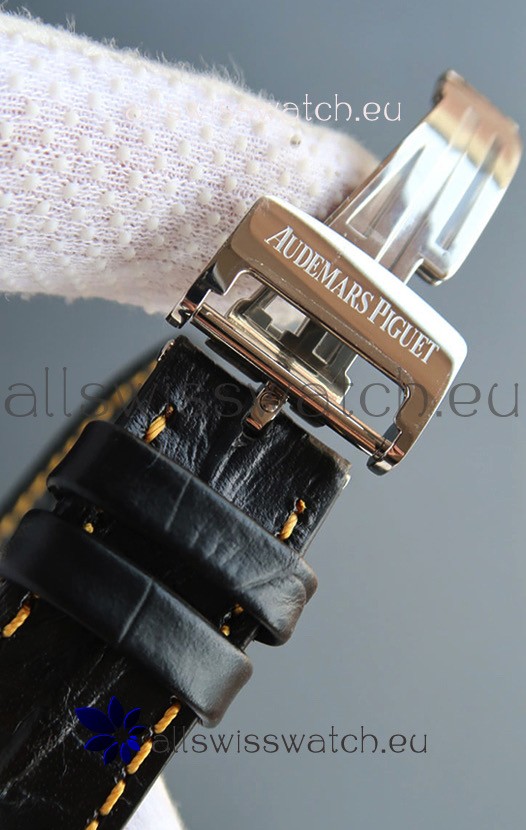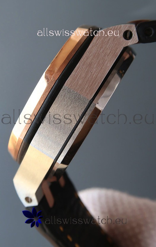 Black Leather Strap with Audemars Piguet Pink Gold Plated Deployment Clasps complete with AP Markings and Engravings like the Originals