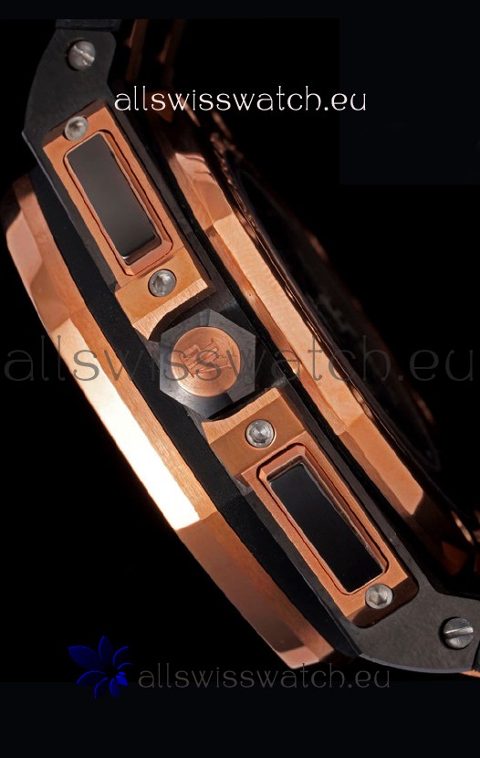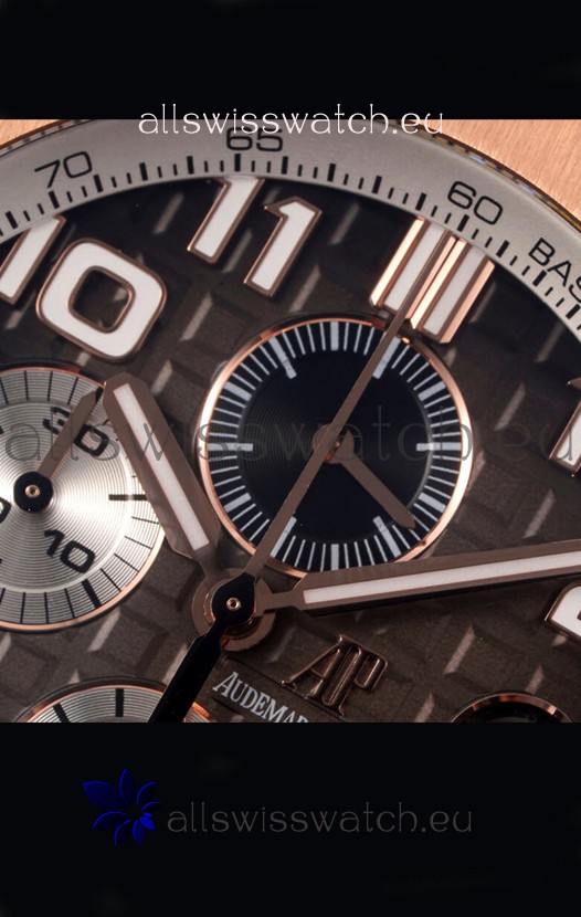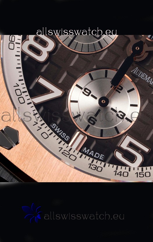 Machinery Layout exactly like Audemars Piguet 3126 Calibre Movement used in Authentic Audemars Piguet Offshore Watches built on Genuine Swiss 7753 Movement architecture with Functional stopwatch feature like the authentic with Seconds hand running at the 12 o clock Sub Dial
