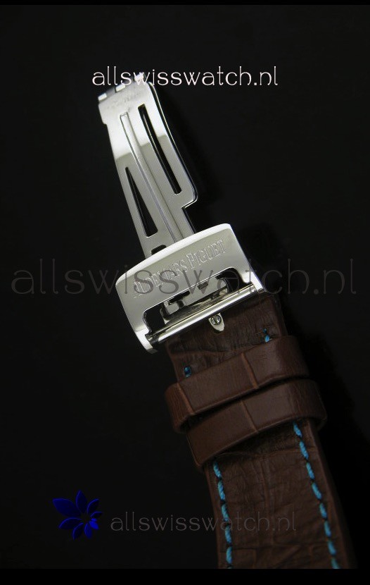 Brown Hornback Leather Strap with Blue Stitching and Polished Deployment Clasp.