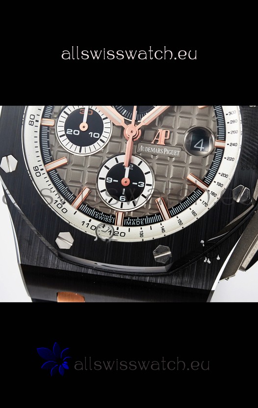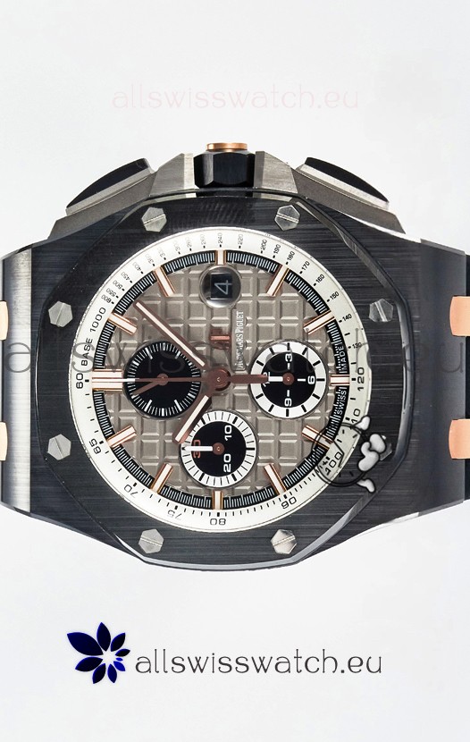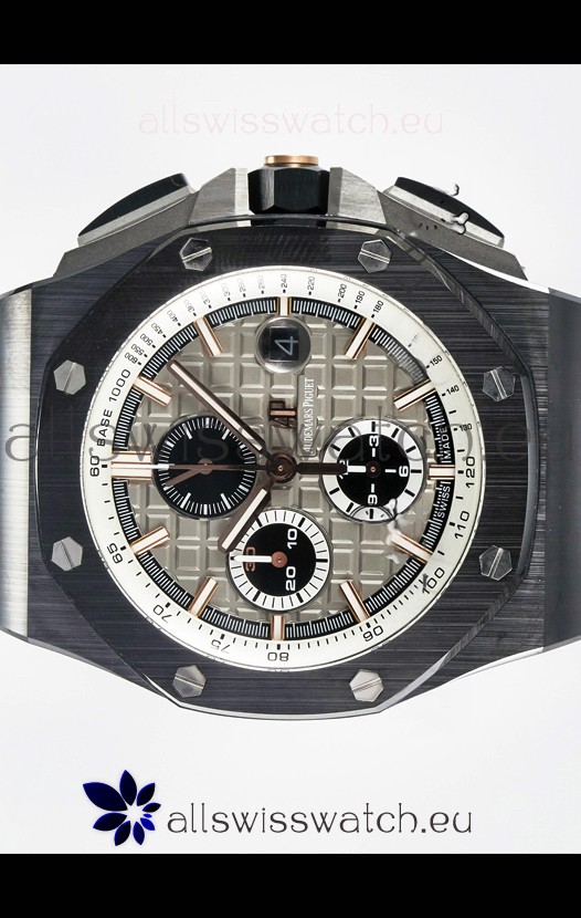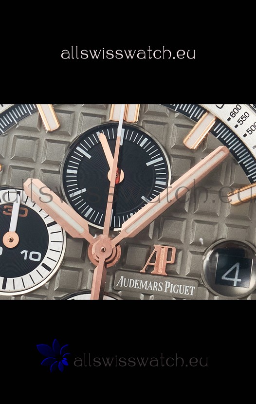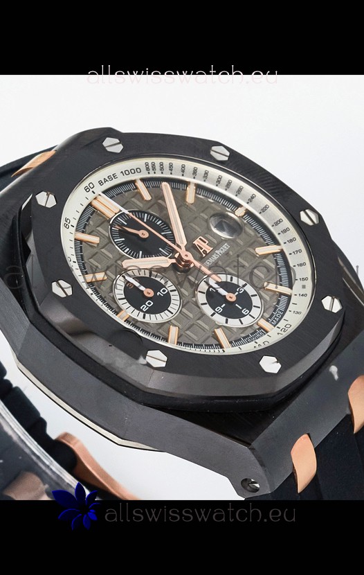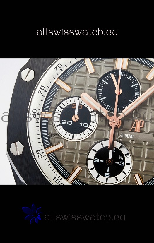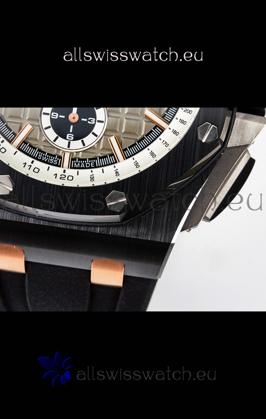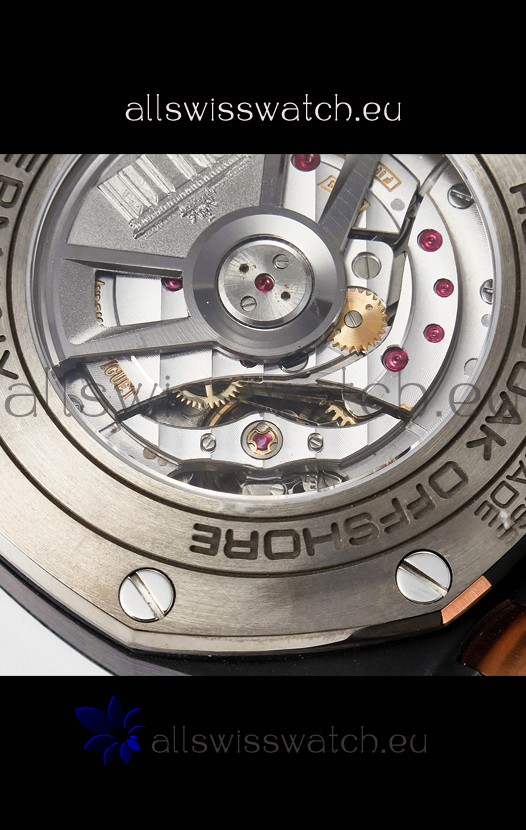 Machinery Layout exactly like Audemars Piguet 3126 Calibre Movement used in Authentic Audemars Piguet Offshore Watches built on Genuine Swiss 7753 Movement architecture with Functional stopwatch feature like the authentic with Seconds hand running at the 12 o clock Sub Dial