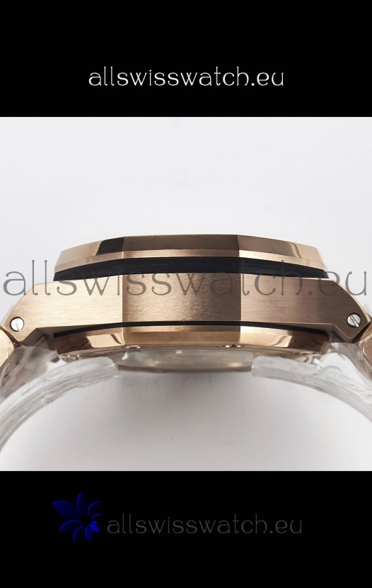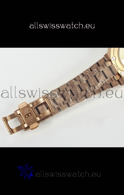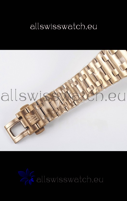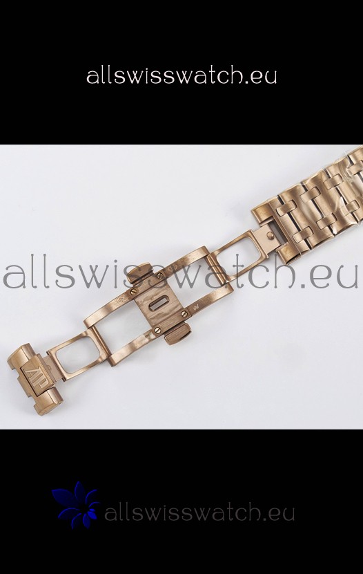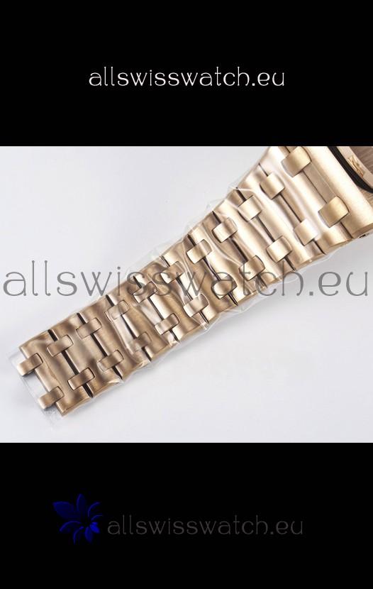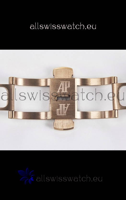 18K Rose Gold Plating on 904L Stainless Steel Strap with Deployment Clasps complete with AP Markings and Engravings like the Originals. Strap is much smoother compared to previous versions with no sharp edges.