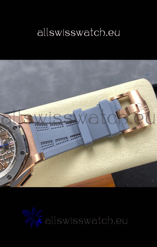 Leather strap with Pink Gold Buckle complete with Audemars Piguet Markings and Engravings. Additional Grey Rubber Strap provided as a free accessory.