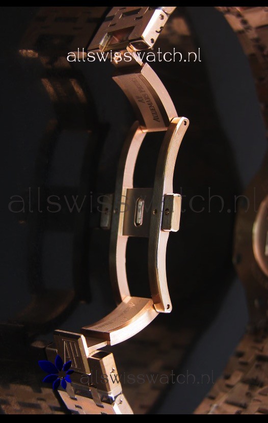 316L Steel Strap with 18K Rose Gold Plating linked with Screws. 18K Rose Gold Plated Folding Clasp complete wtih Fine AP Markings.