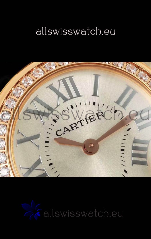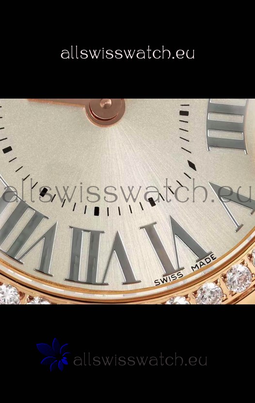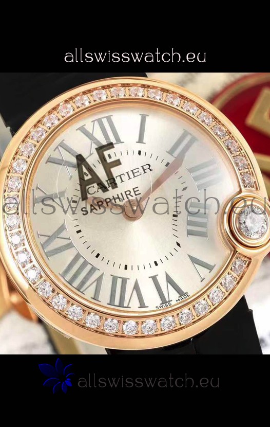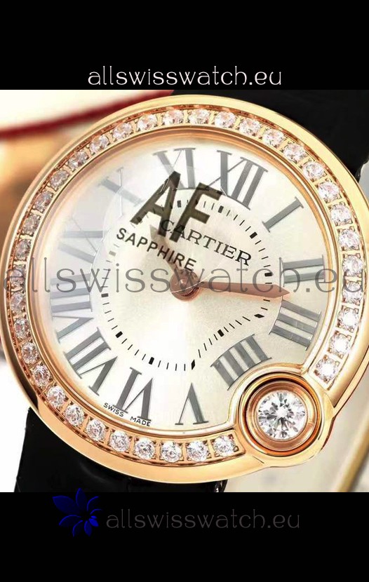 Ballon Blanc De Cartier Swiss Quartz Replica Watch Diamonds Bezel Rose Gold Casing Leather Strap