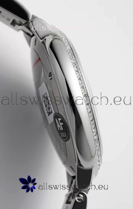 Steel Dial with Roman Hour Numerals. Swiss Cut Diamonds Bezel