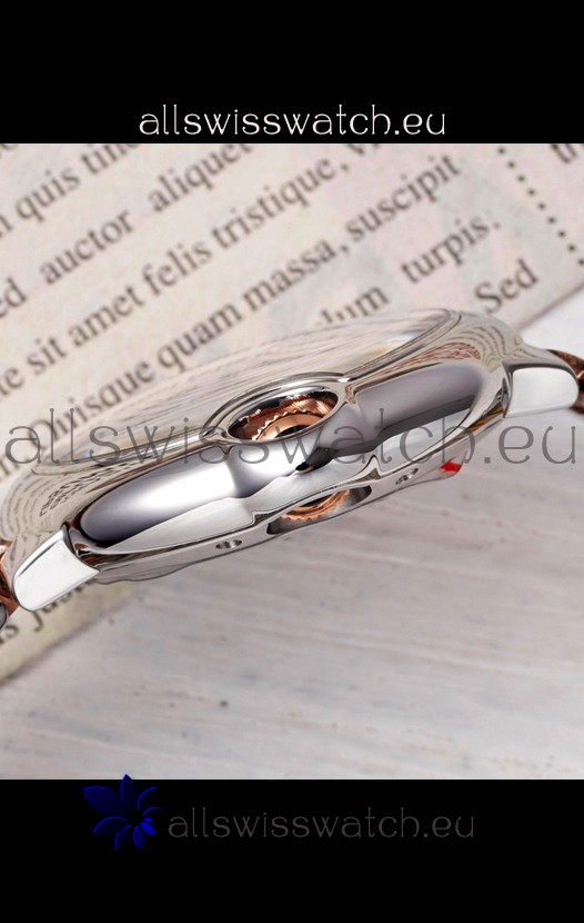 18K Rose Gold Two Tone Plating on 904L Stainless Steel Polished Stainless Steel Casing. Swiss Cut Diamonds Bezel