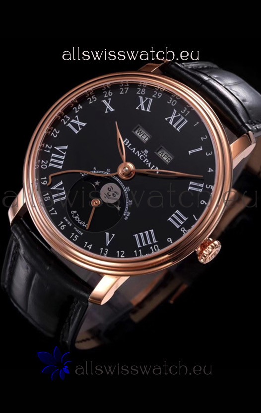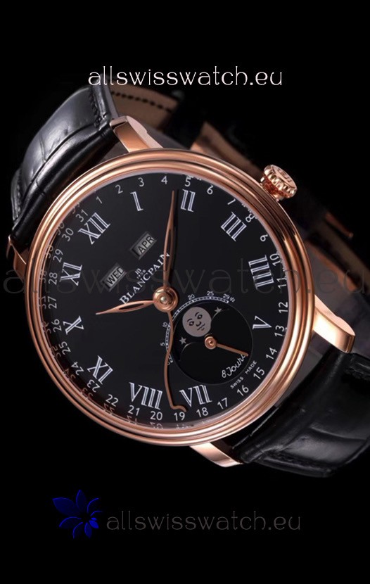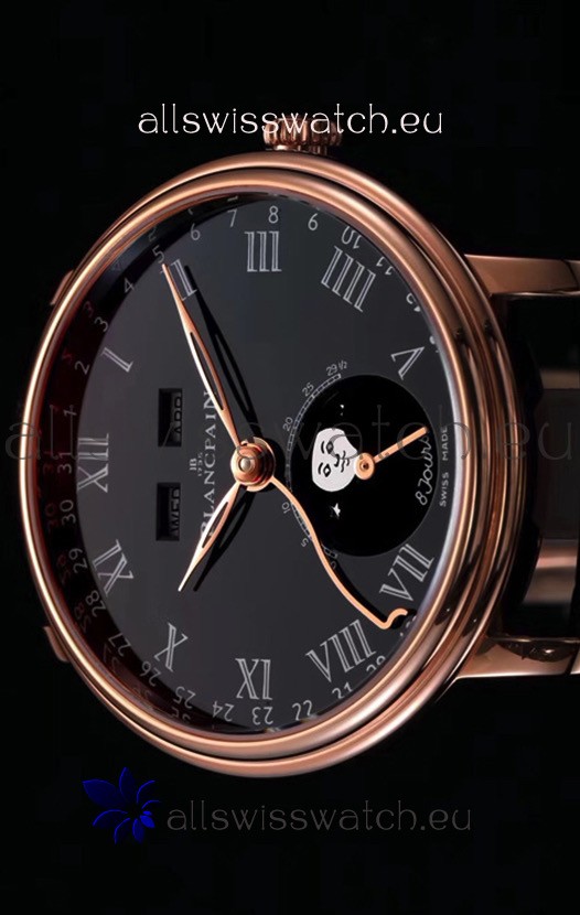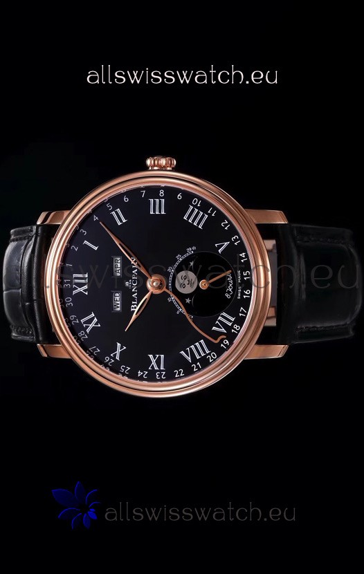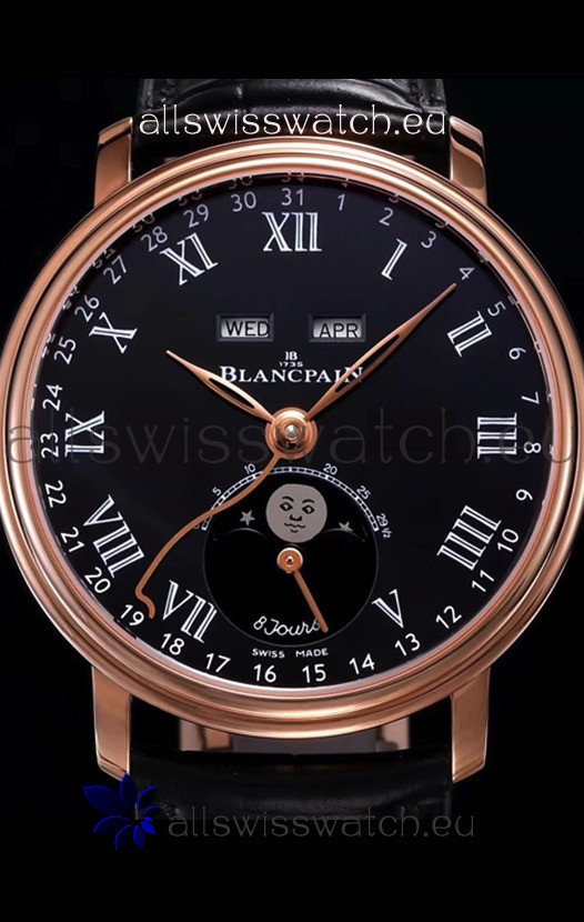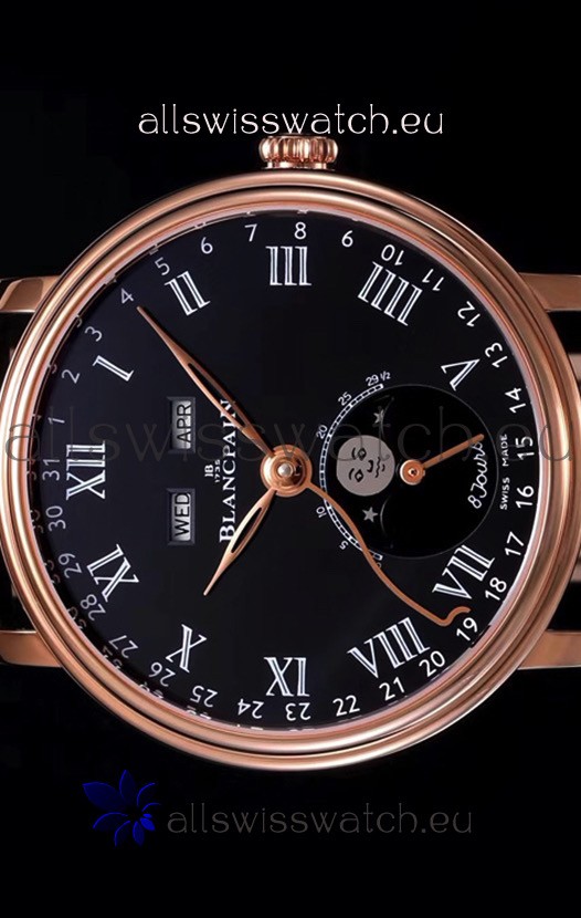 Blancpain "Villeret Quantième Complet" 904L Steel Rose Gold Watch in Black Dial