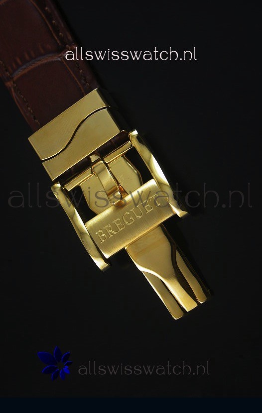 Genuine Black Leather Strap with Yellow Gold Plated Folding Clasps complete with Breguet Markings and Engravings