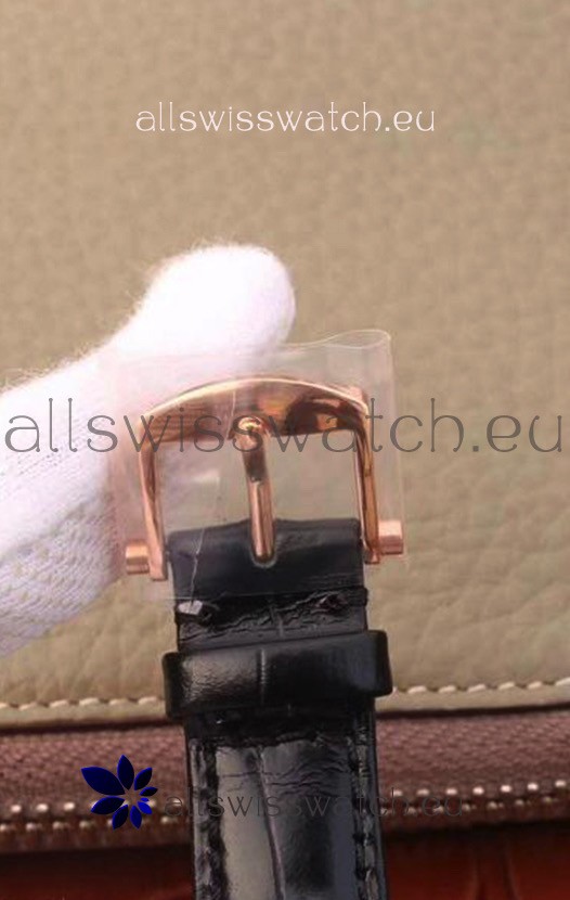 Genuine Black Leather Strap with Breguet Stamped Markings on Strap. Polished Stainless Steel Pink Gold Plated Clasp with Breguet Markings.