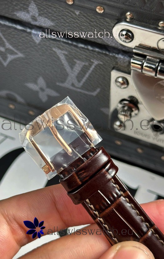 Genuine Black Leather Strap with Breguet Stamped Markings on Strap. Polished Stainless Steel Pink Gold Plated Clasp with Breguet Markings.