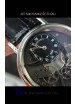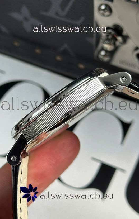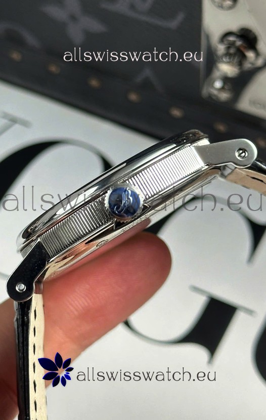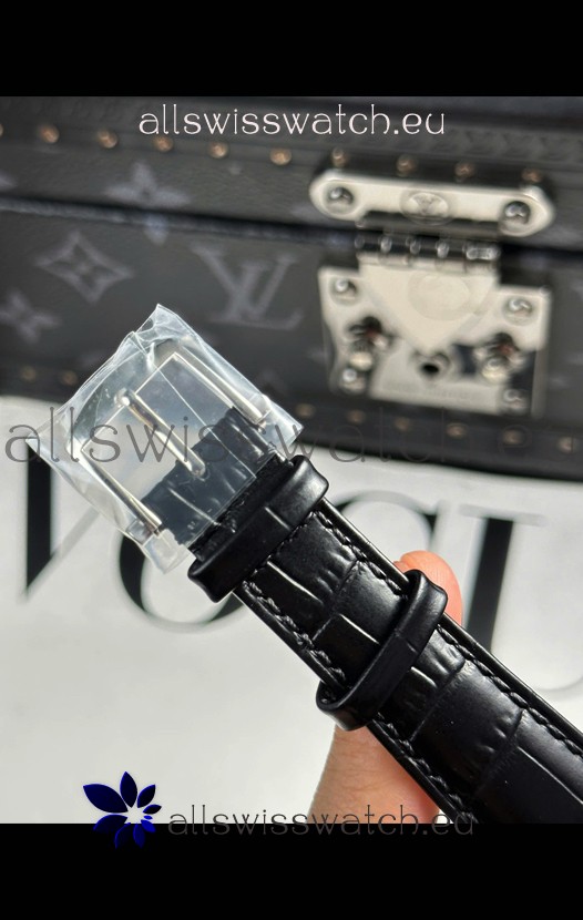 Genuine Black Leather Strap with Breguet Stamped Markings on Strap. Polished Stainless Steel Pink Gold Plated Clasp with Breguet Markings.