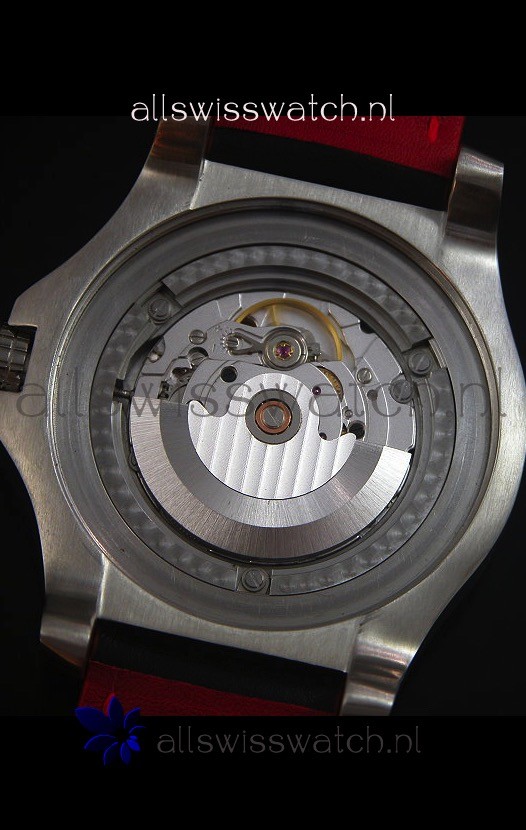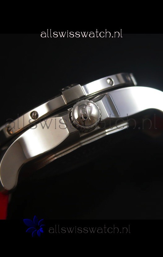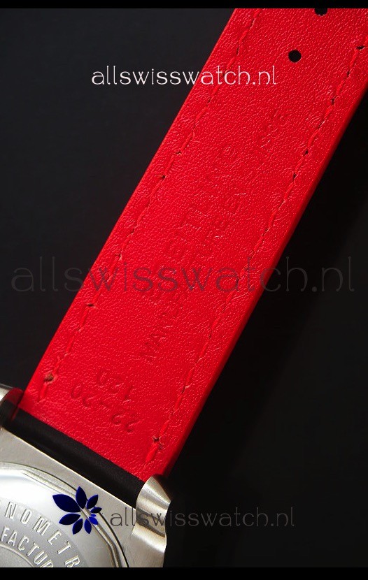 Genuine Black Leather Strap with Red Stitching with Tang Buckle and additional Rubber Strap with Steel Folding Clasps provided for Free.