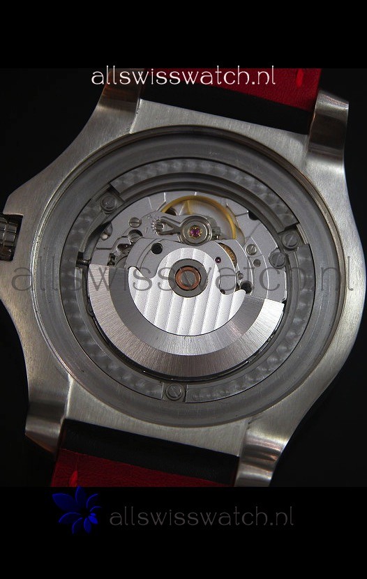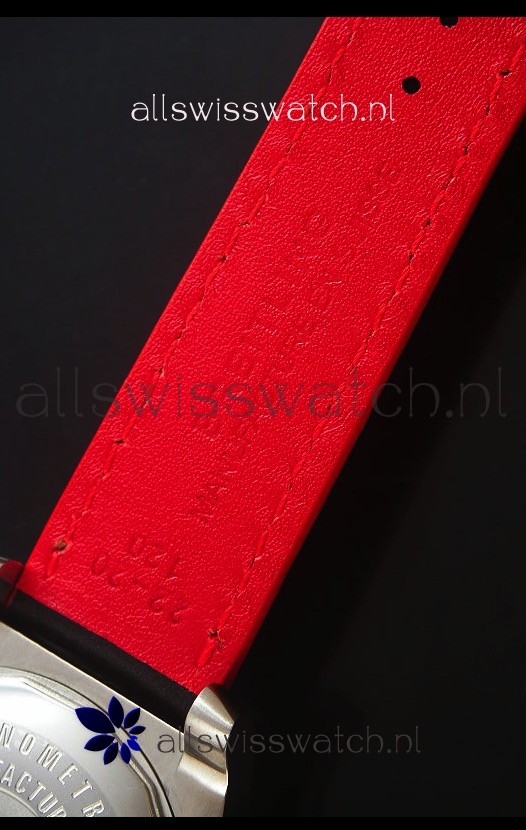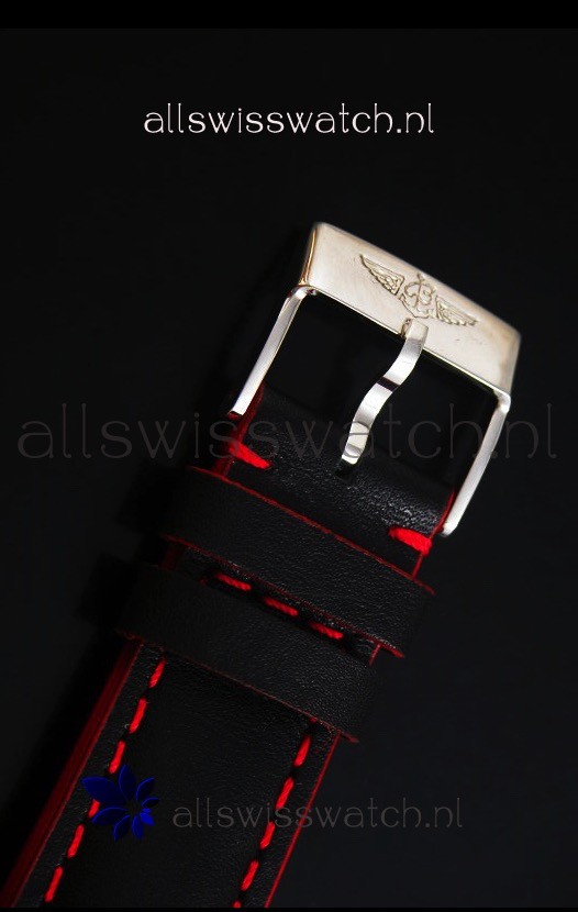 Genuine Black Leather Strap with Red Stitching with Tang Buckle and additional Rubber Strap with Steel Folding Clasps provided for Free.