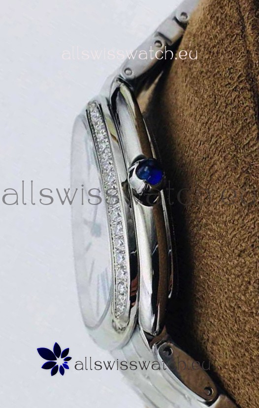 904L Polished Steel Casing with Stainless Steel Bezel embedded with Swiss Cut diamonds.