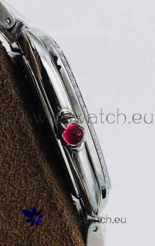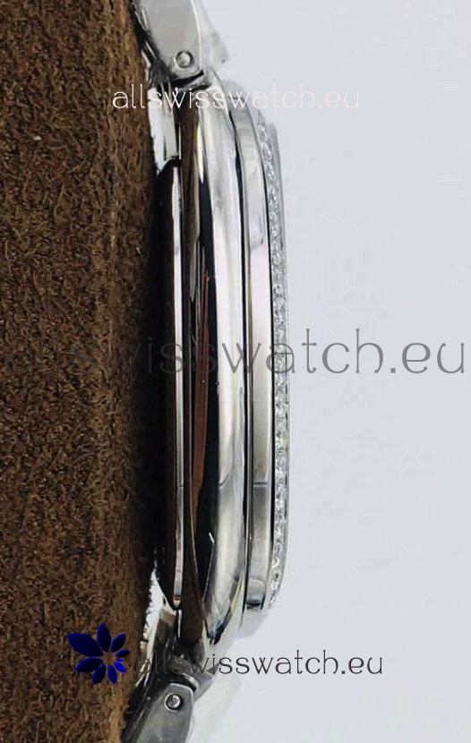 904L Polished Steel Casing with Stainless Steel Bezel embedded with Swiss Cut diamonds.