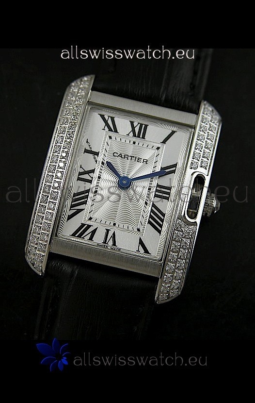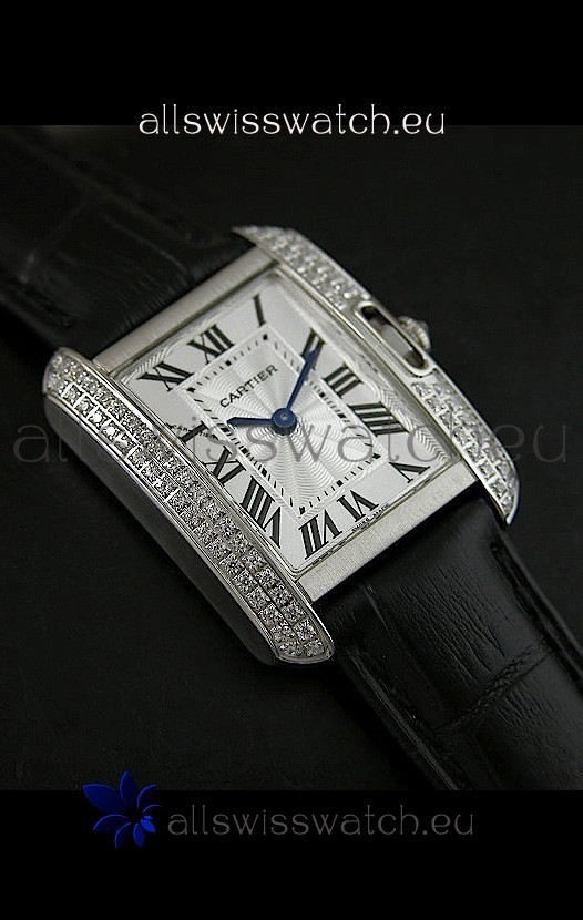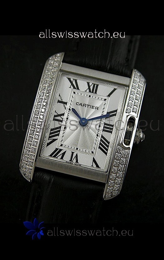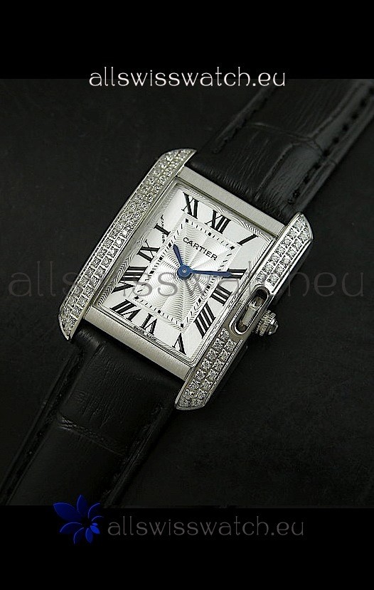 Watch name: Cartier Louis Japananese Replica Ladies Diamond Watch in Black Strap
