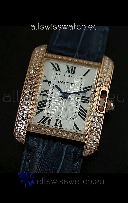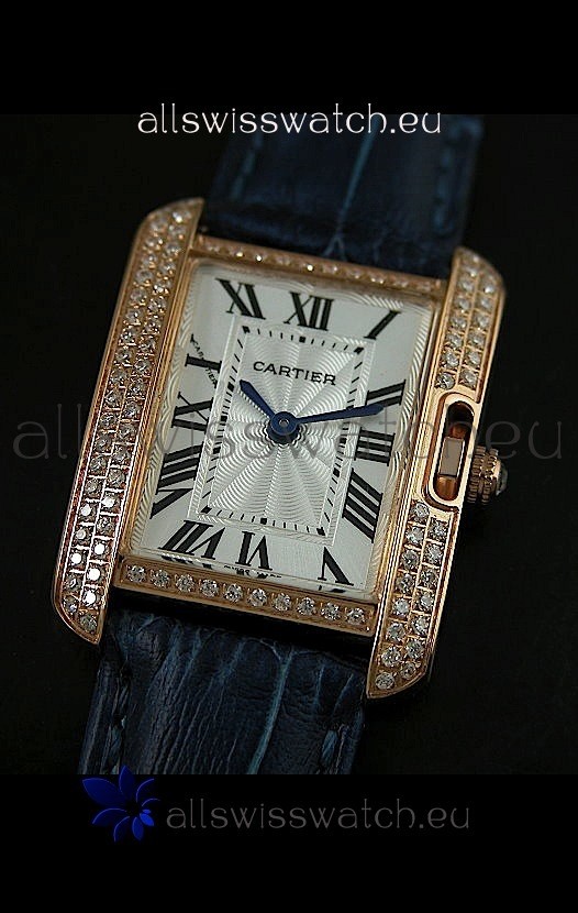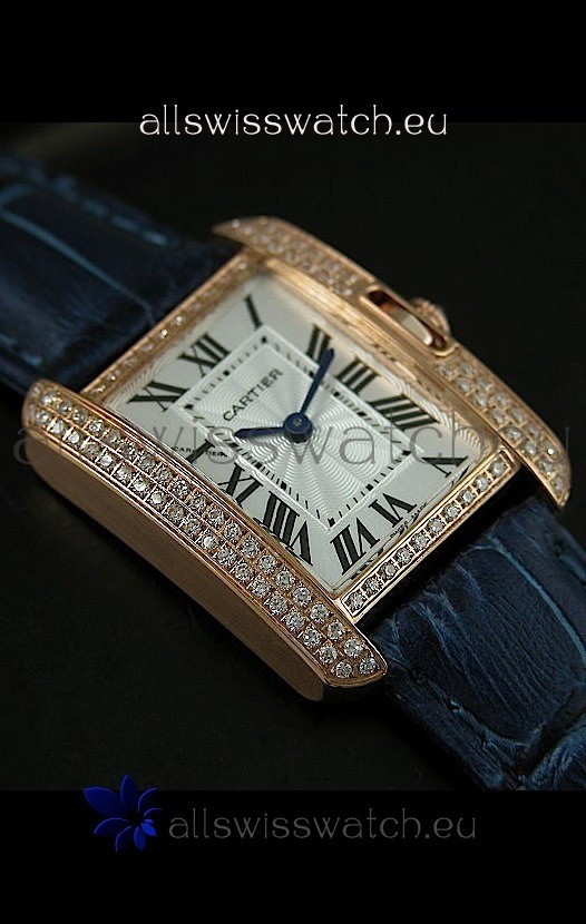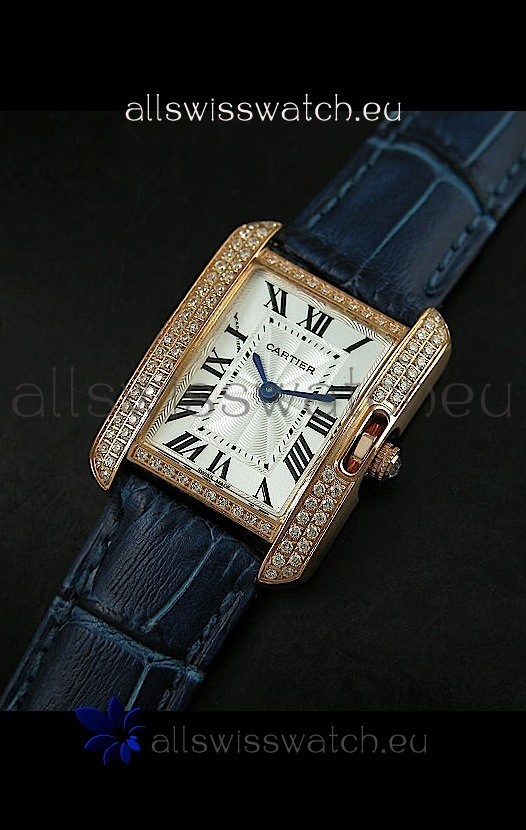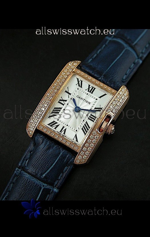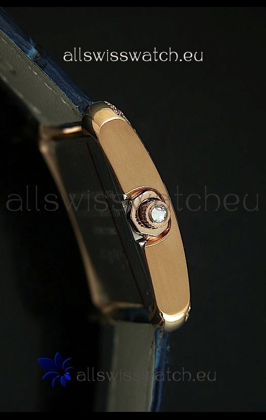 Watch name: Cartier Louis Japananese Replica Ladies Rose Gold Diamond Watch in Blue Strap