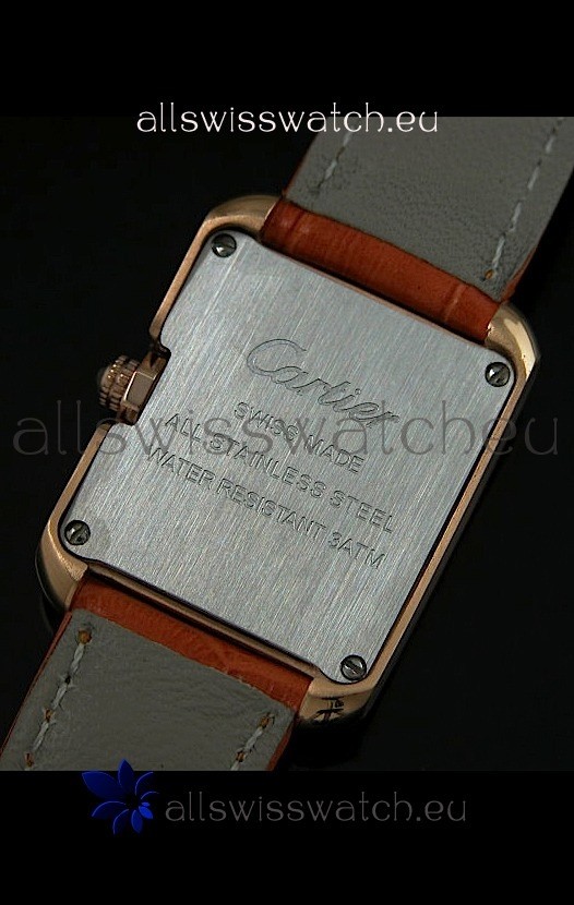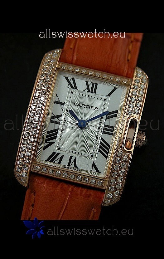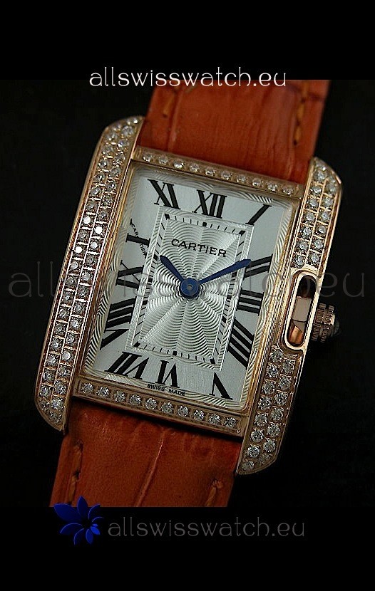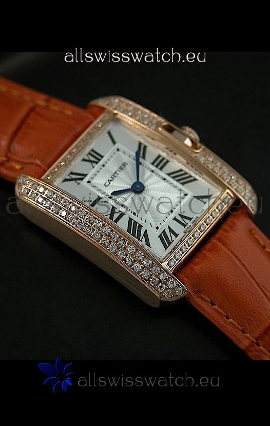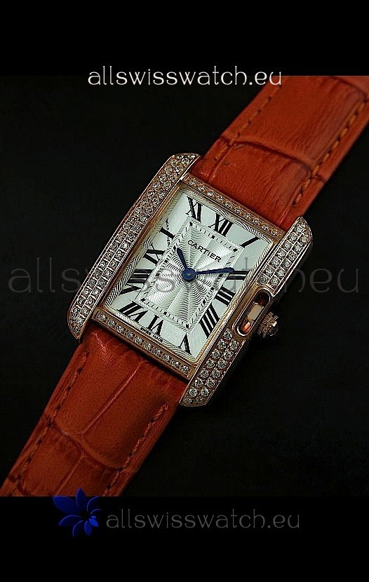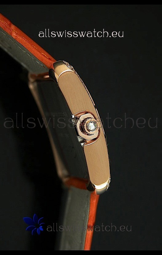 Watch name: Cartier Louis Japananese Replica Ladies Rose Gold Diamond Watch in Orange Strap