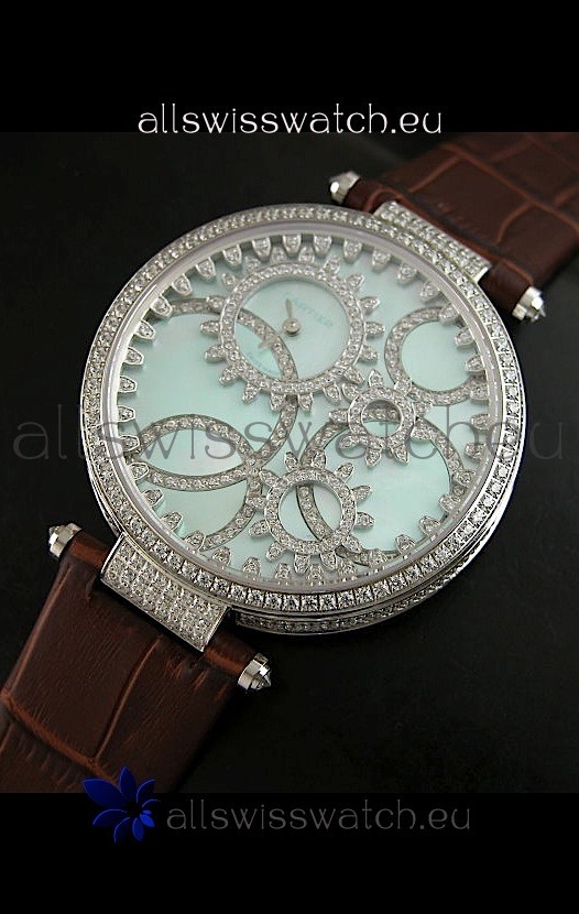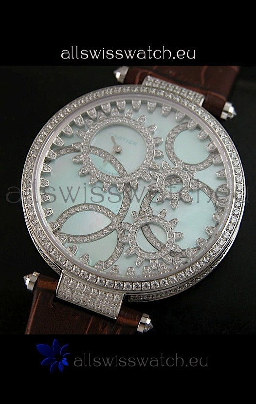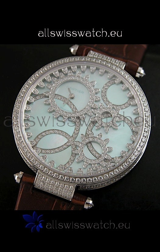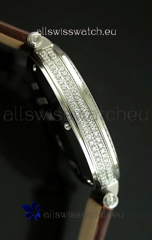 Cartier Replica Watch with Diamonds Embedded Dial Bezel in Steel Case/Brown Strap