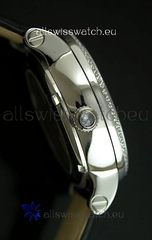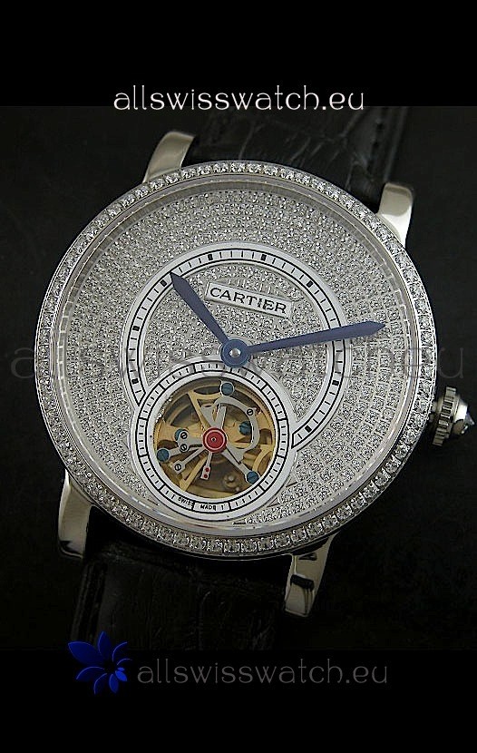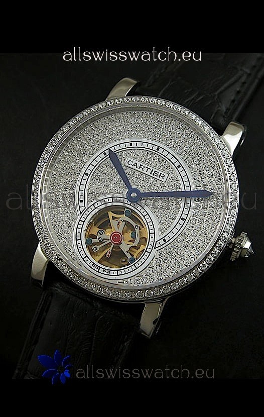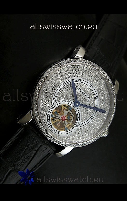 Watch name: Cartier Ronde de Tourbillon Japanese Replica Diamond Watch in Black Strap