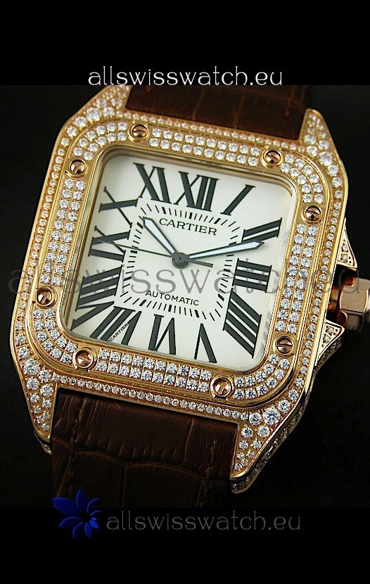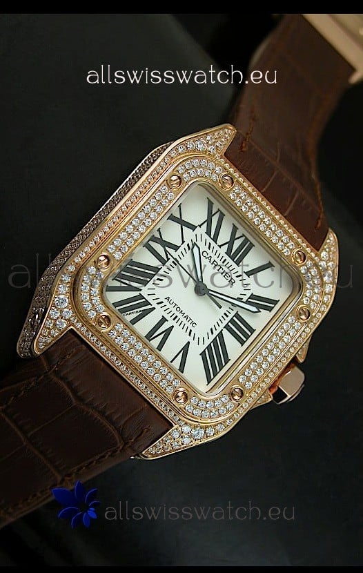 Cartier Santos 100 1:1 Mirror Replica Rose Gold Diamonds Watch 42MM