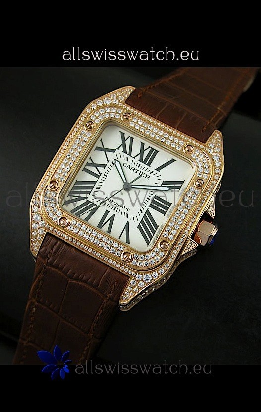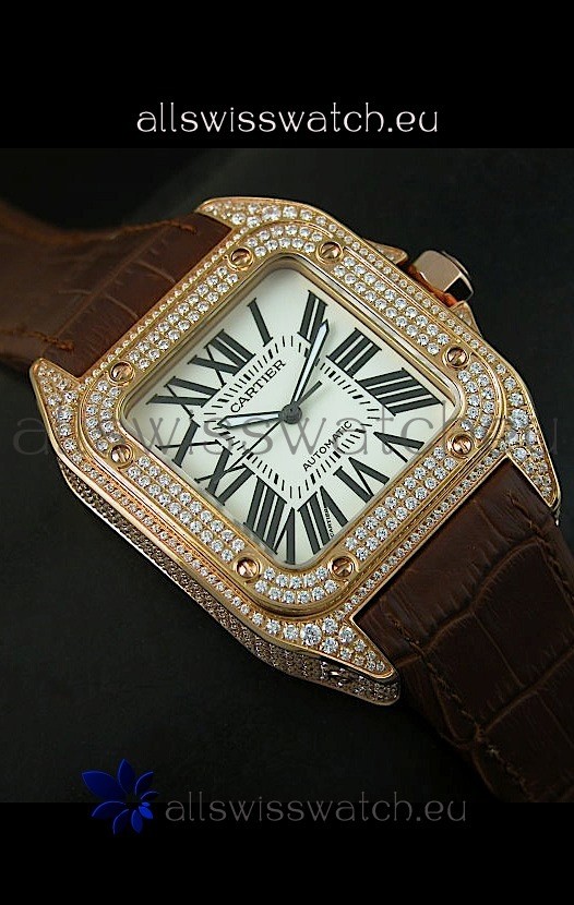 You're reviewing: Cartier Santos 100 1:1 Mirror Replica Rose Gold Diamonds Watch 42MM