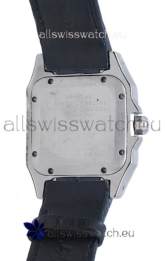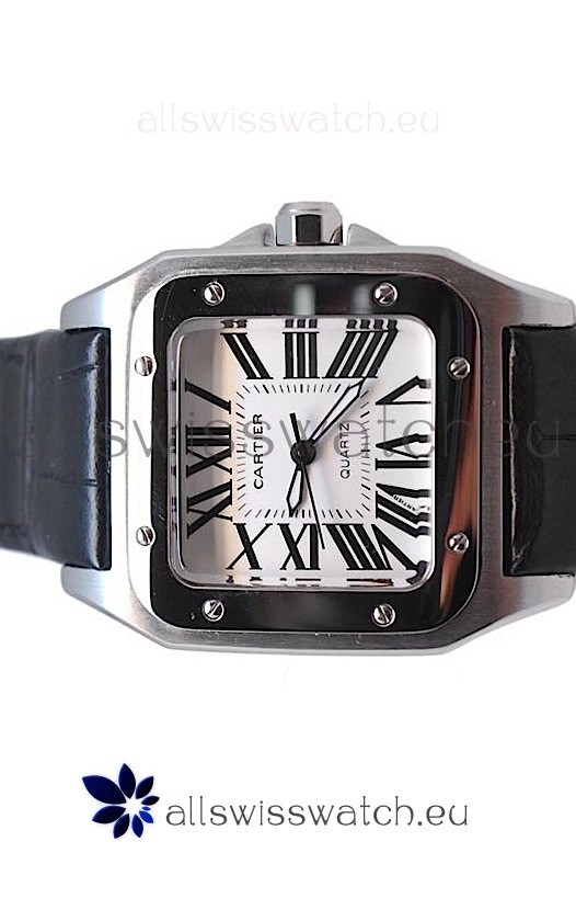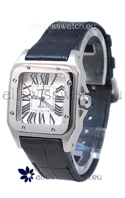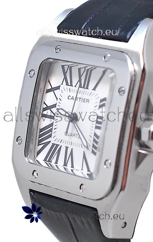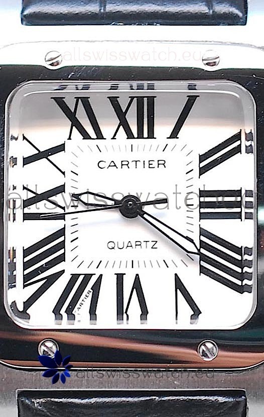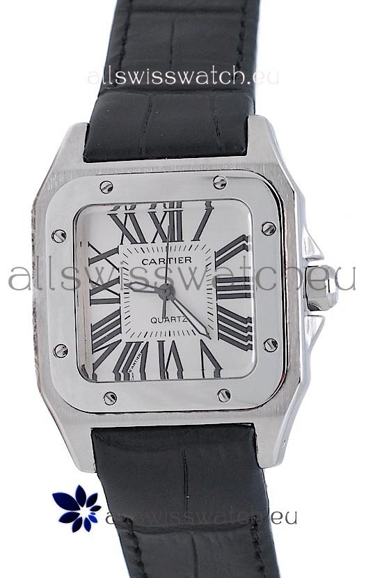 Cartier Santos 100 Japanese Ladies Replica Watch in Black Leather Strap