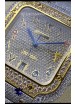 Diamonds Embedded Dial with Colored Arabic Hour Numerals, Date Window at 6 O'Clock and Signature Cartier Markings at the 7 O'Clock Counter. Blue Sapphires on Stem Tip