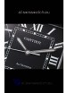 Black Dial with Roman Hour Numerals, Signature Cartier Markings at the 7 O'Clock Counter. Blue Sapphires on Stem Tip. Date Indicator at 6 O'Clock