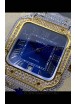 Blue Dial with Roman Hour Numerals, Date Window at 6 O'Clock and Signature Cartier Markings at the 7 O'Clock Counter. Blue Sapphires on Stem Tip