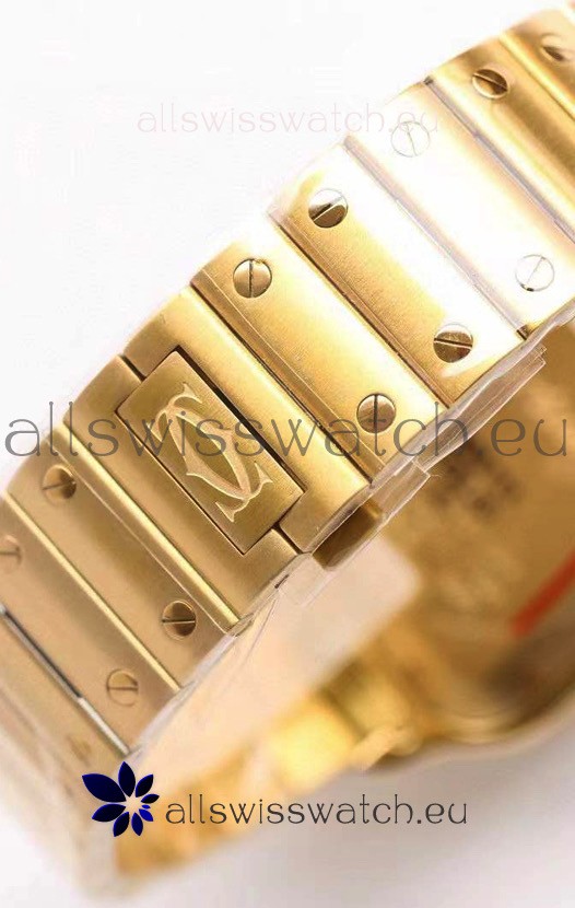 Yellow Gold Plating on 904L Steel Strap linked with Screws with Folding Clasps complete with Cartier Markings and Engravings. Quick Release System as per the Originals.
