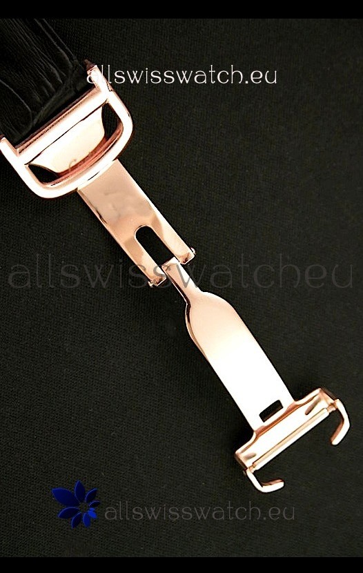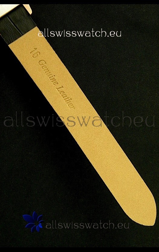 Strap: Black Leather Strap with Double deployant Clasp and Double Release Catch
