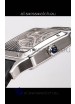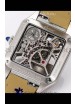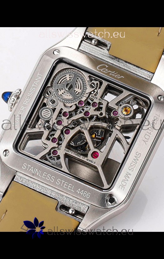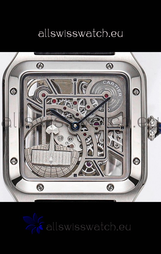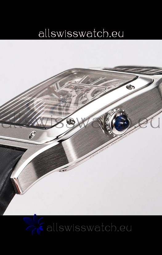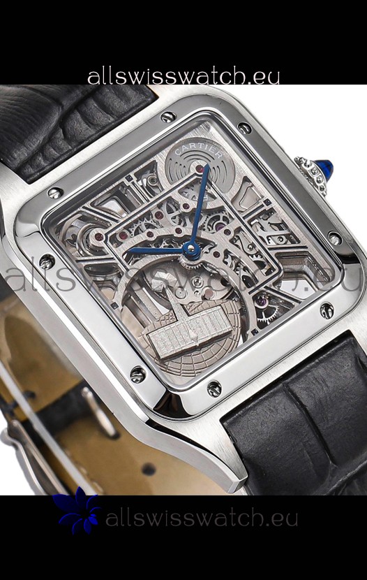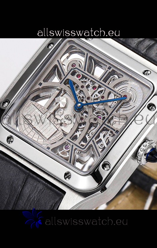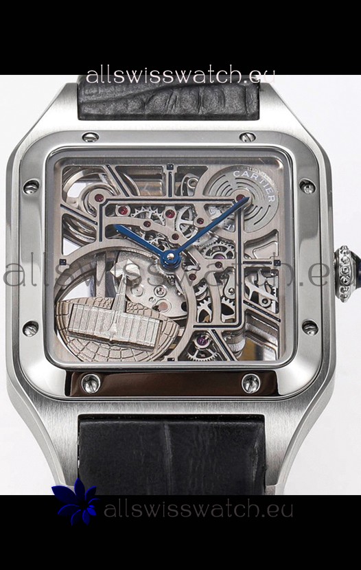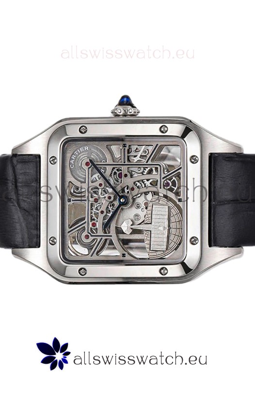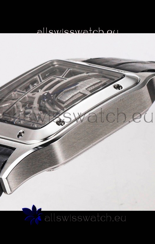Cartier Santos Dumont Skeleton Stainless Steel Watch in Black Leather Strap 43.5MM
