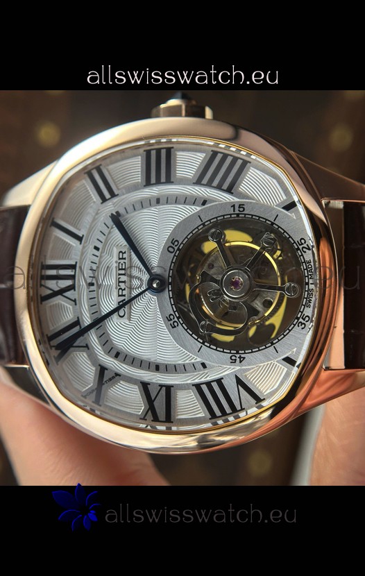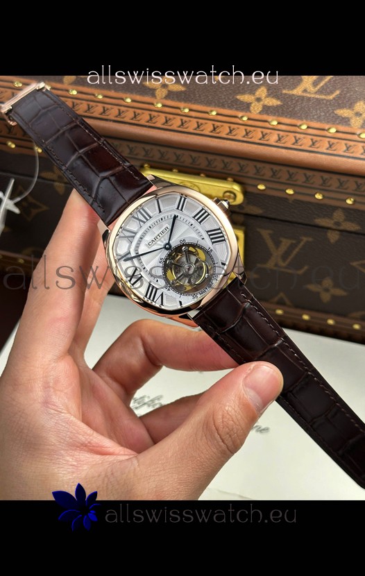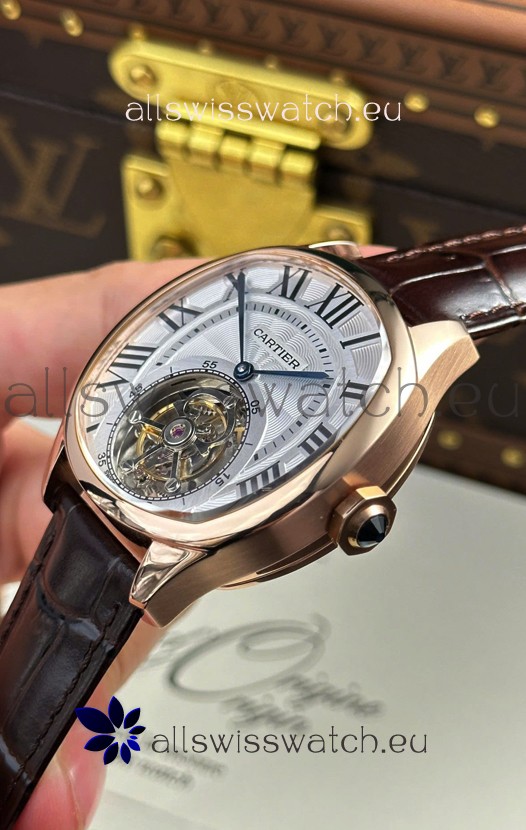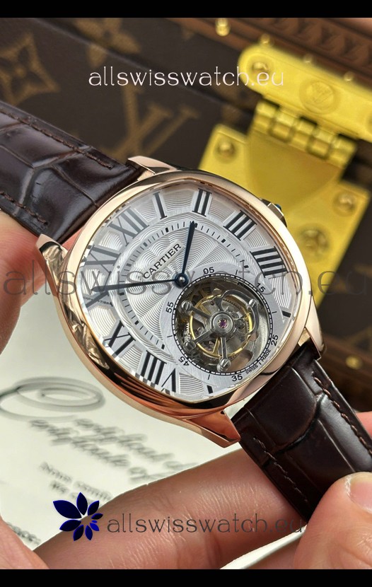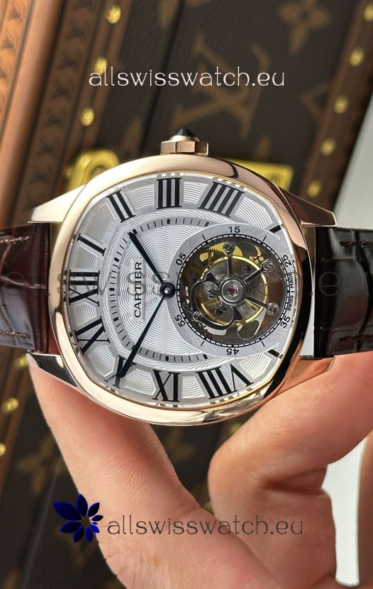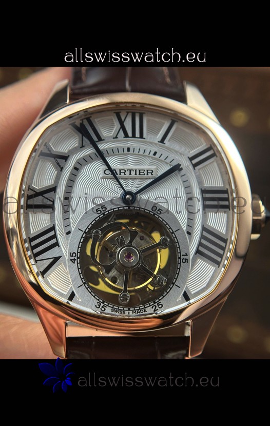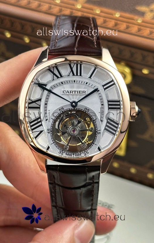 Drive De Cartier Rose Gold Tourbillon Super clone Replica Watch in White Dial