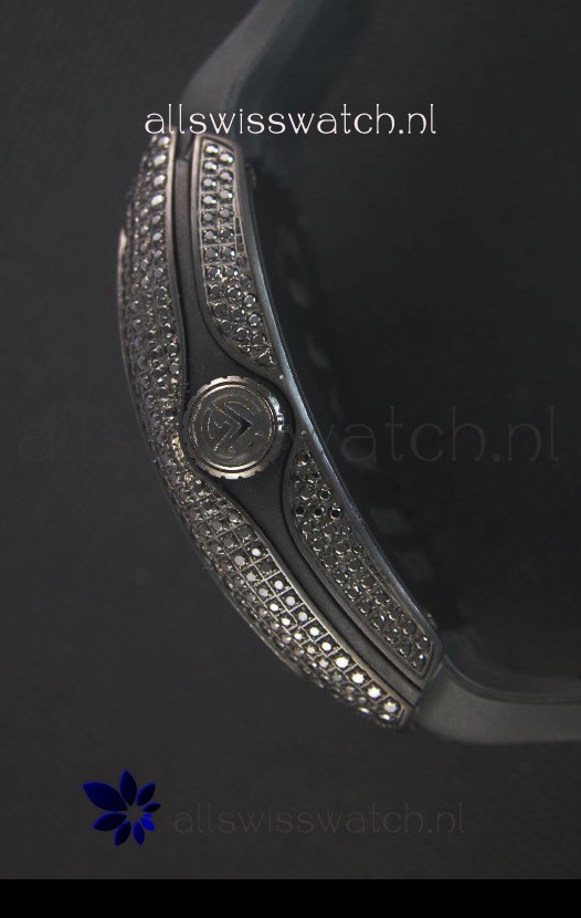 PVD Plating on 316L Stainless Steel Case with Lab Created Diamonds encrusted onto the Case.