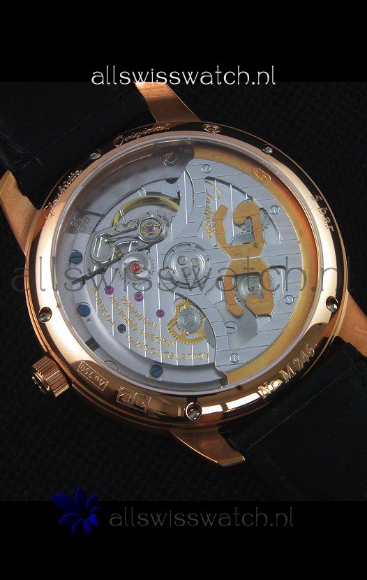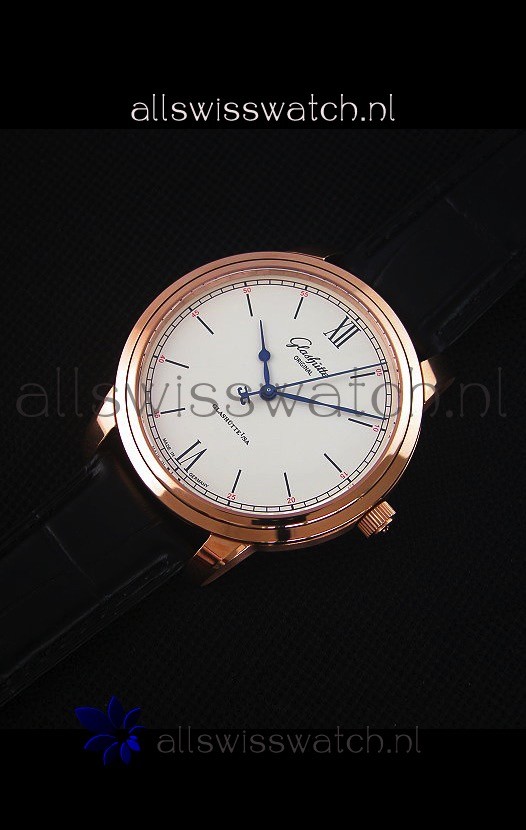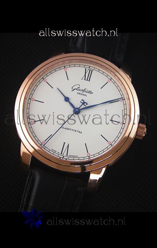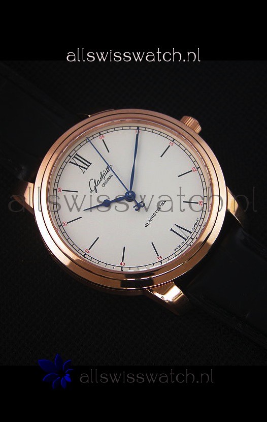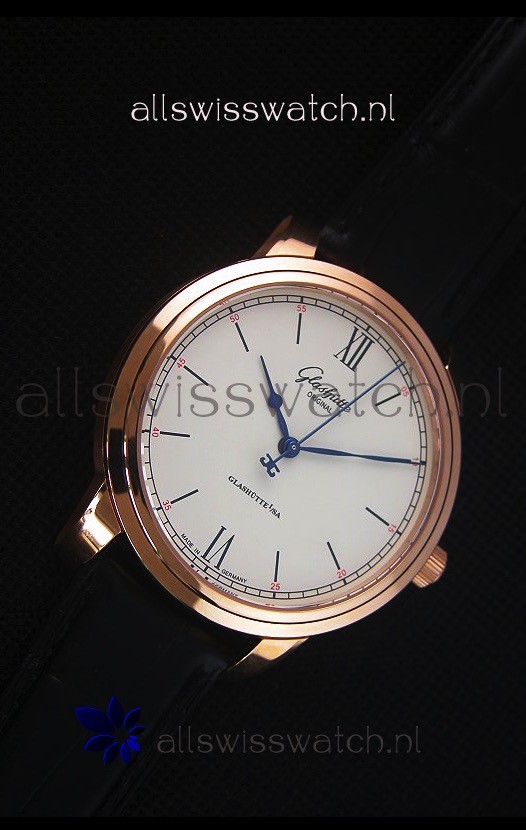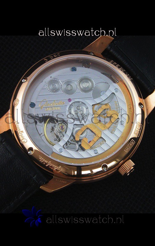 316L Stainless Steel Polished Casing witih 18K Rose Gold Plating complete with Glashuette Markings and Engravings