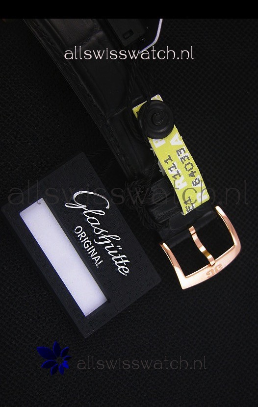 Genuine Leather Strap complete with Glashuette Markings and Engravings with Rose Gold Plated Tang Buckle.