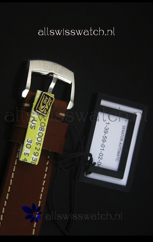 Genuine Brown Leather Strap complete with Glashuette Markings and Engravings with Steel Tang Buckle.